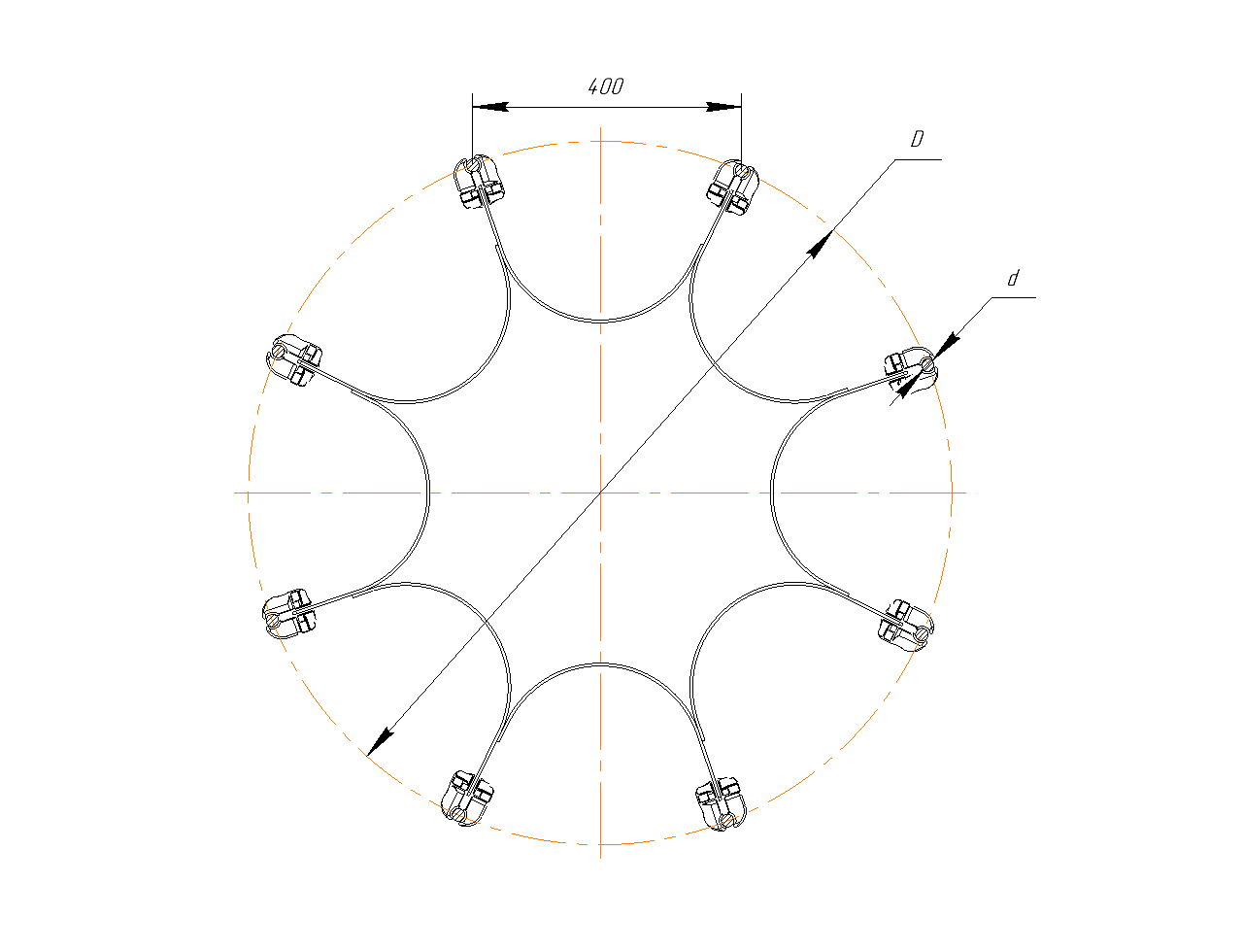 Распорка глухая восьмилучевая 8РГ-3-400 применяется для фиксации на заданном расстоянии восьми алюминиевых или сталеалюминиевых проводов расщепленной фазы воздушных линий электропередачи и распределительных устройств.