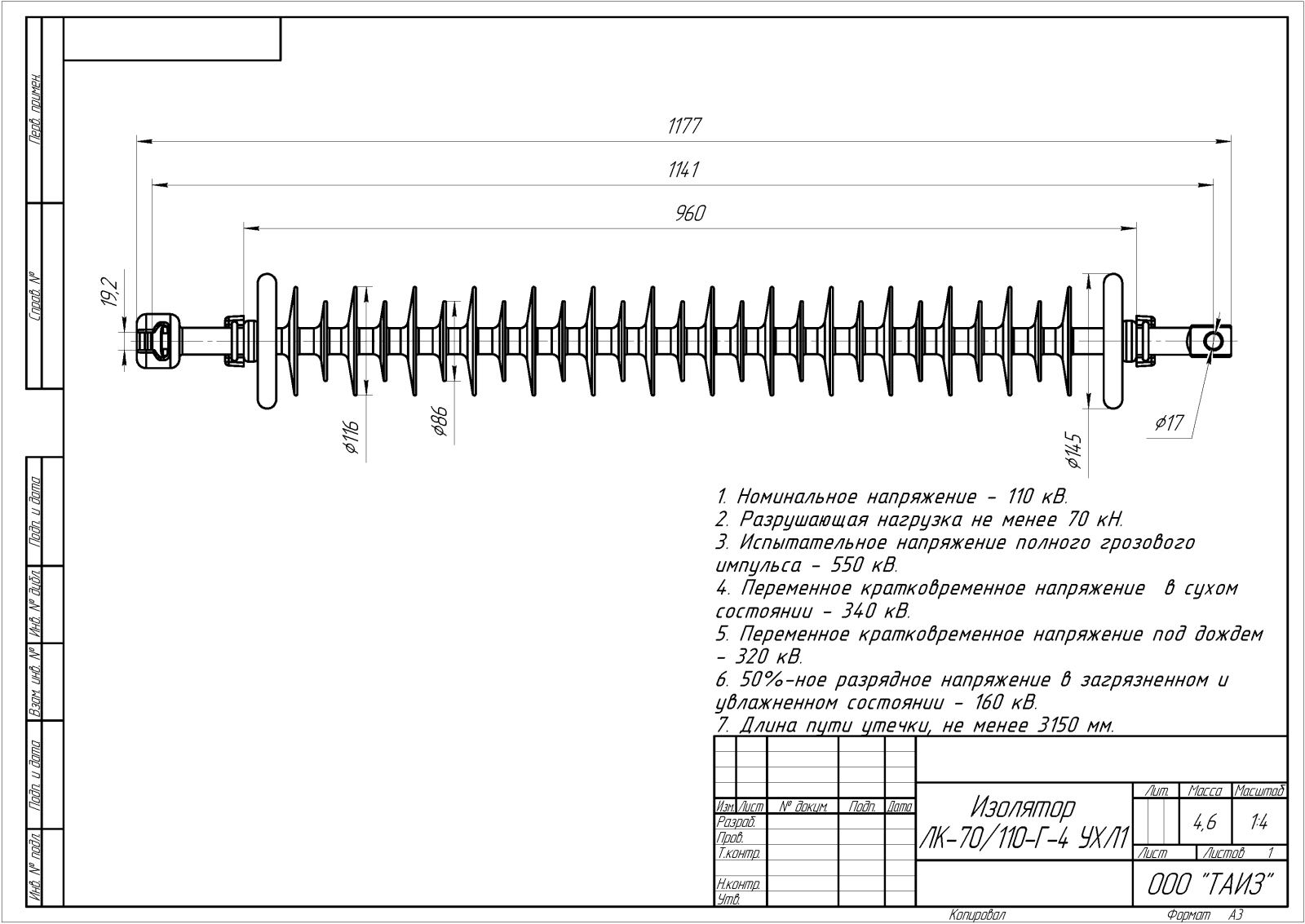 Масса, длина изоляционной части, присоединительные размеры, соответствие, расположения арматуры;