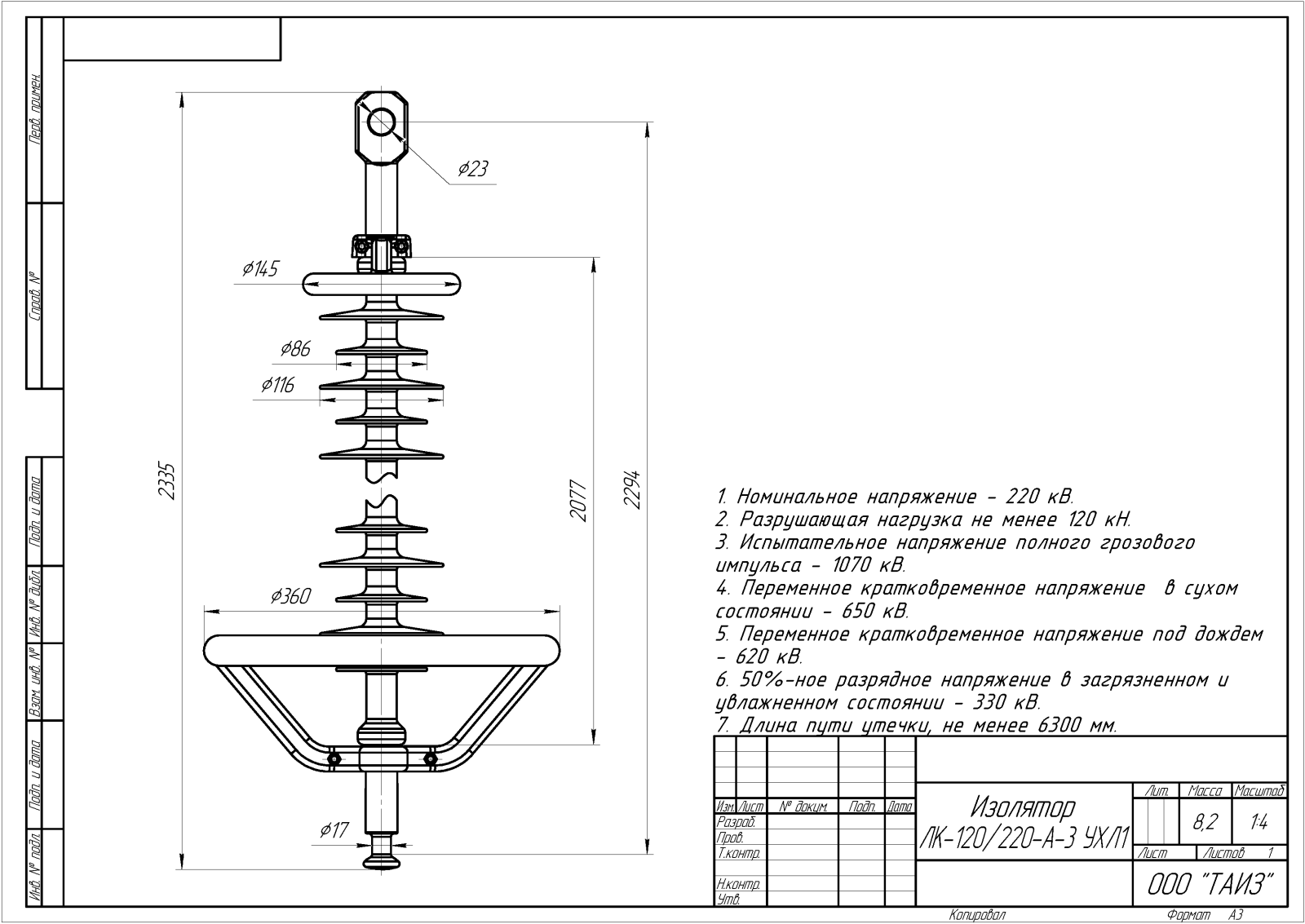 Масса, длина изоляционной части, присоединительные размеры, соответствие, расположения арматуры;
