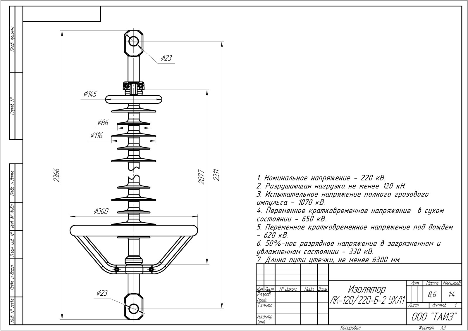 Масса, длина изоляционной части, присоединительные размеры, соответствие, расположения арматуры;