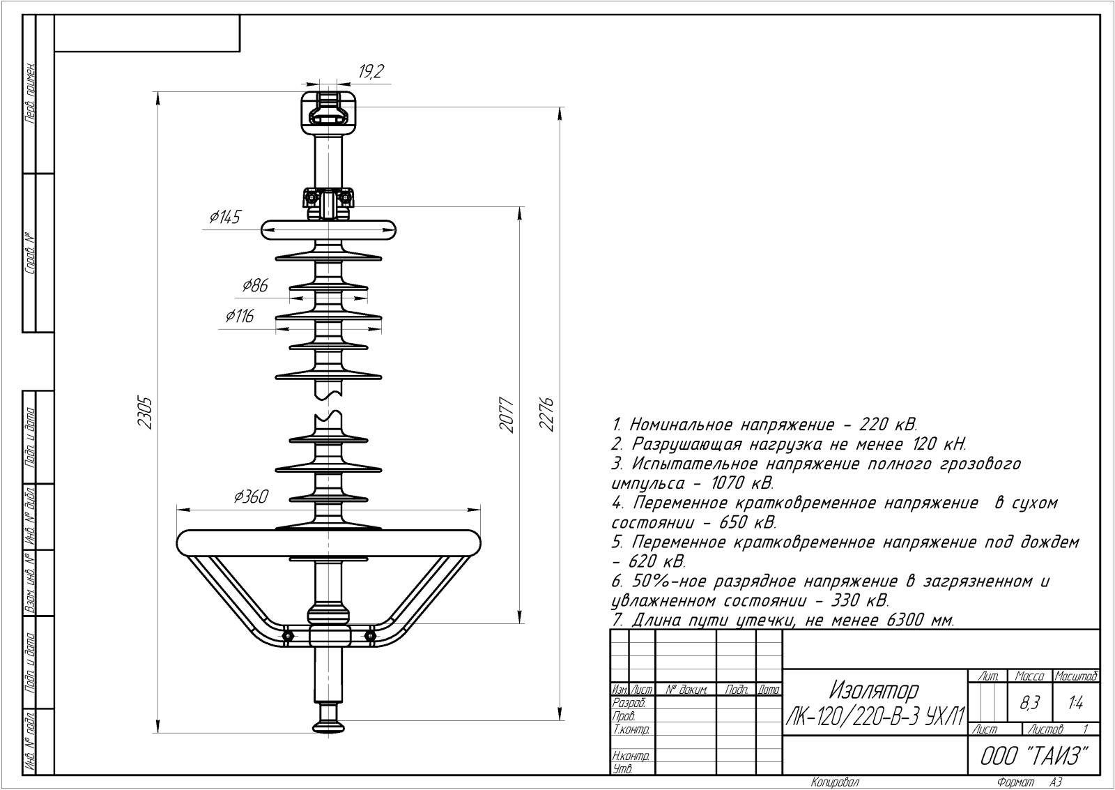 Масса, длина изоляционной части, присоединительные размеры, соответствие, расположения арматуры;