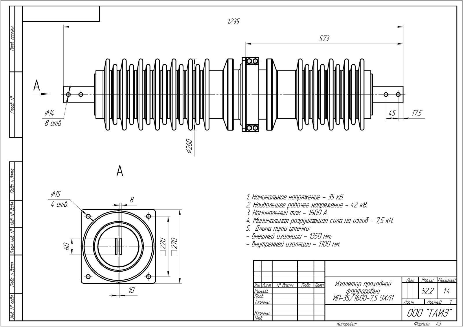 Изолятор проходной фарфоровый ИП-35/1600-7,5 УХЛ1