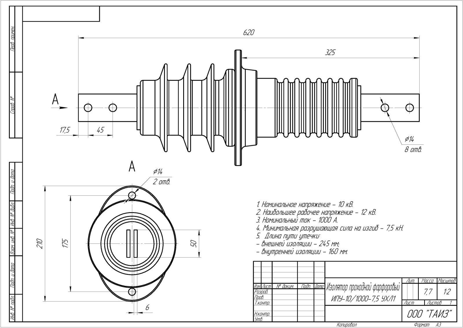 Изолятор проходной фарфоровый ИПУ-10/1000-7,5 УХЛ1