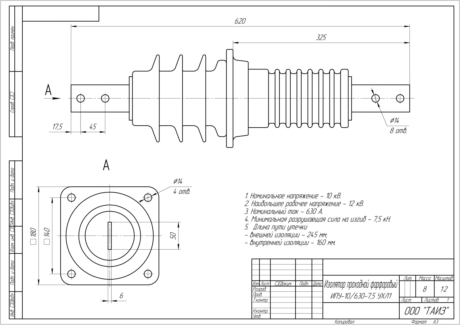 Изолятор проходной фарфоровый ИПУ-10/630-7,5 УХЛ1