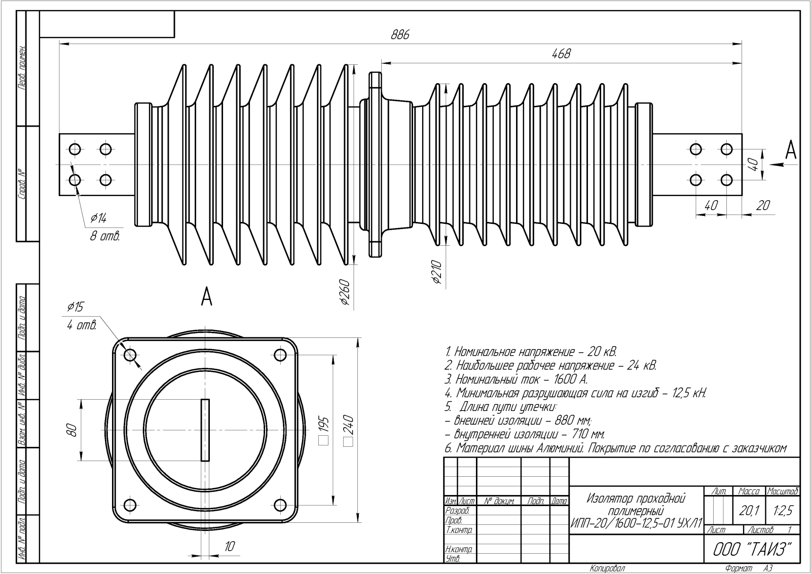 Изоляторы проходные полимерные ИПП-20/1600-12,5-01 УХЛ1 предназначены для проведения, соединения и изоляции токоведущих частей закрытых распределительных устройств электростанций и подстанций, комплектных распределительных устройств с открытыми распределительными устройствами или линиями электропередачи, а также для закрытых токопроводов переменного тока напряжением 6 - 35 кВ. частотой 50 Гц, расположенных в районах с I— IV степенью загрязнения по ГОСТ 9920.