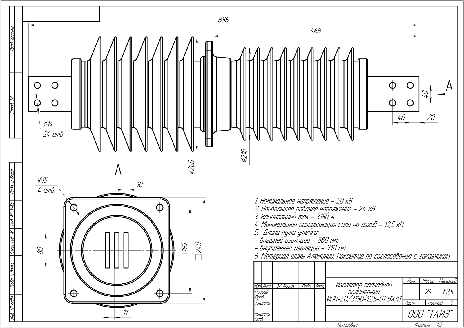 Изолятор проходной полимерный ИПП-20/3150-12,5-01 УХЛ1