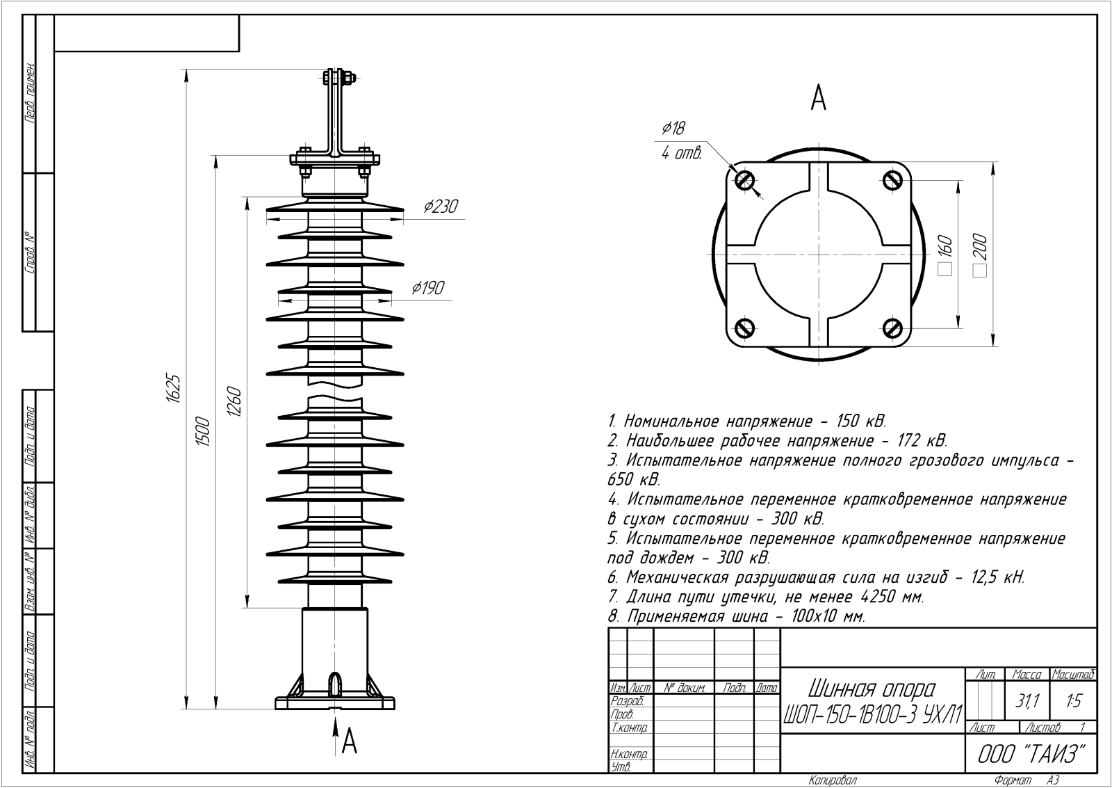 Главная » Продукция » Шинные опоры » Шинные опоры для жесткой ошиновки с вертикальными плоскими шинами » Шинные опоры для жесткой ошиновки 150 кВ » ШОП-150-1В100-3 УХЛ1