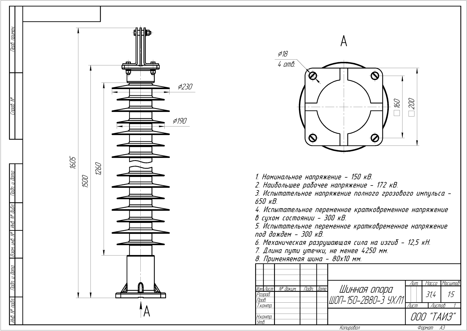 Главная » Продукция » Шинные опоры » Шинные опоры для жесткой ошиновки с вертикальными плоскими шинами » Шинные опоры для жесткой ошиновки 150 кВ » ШОП-150-2В80-3 УХЛ1