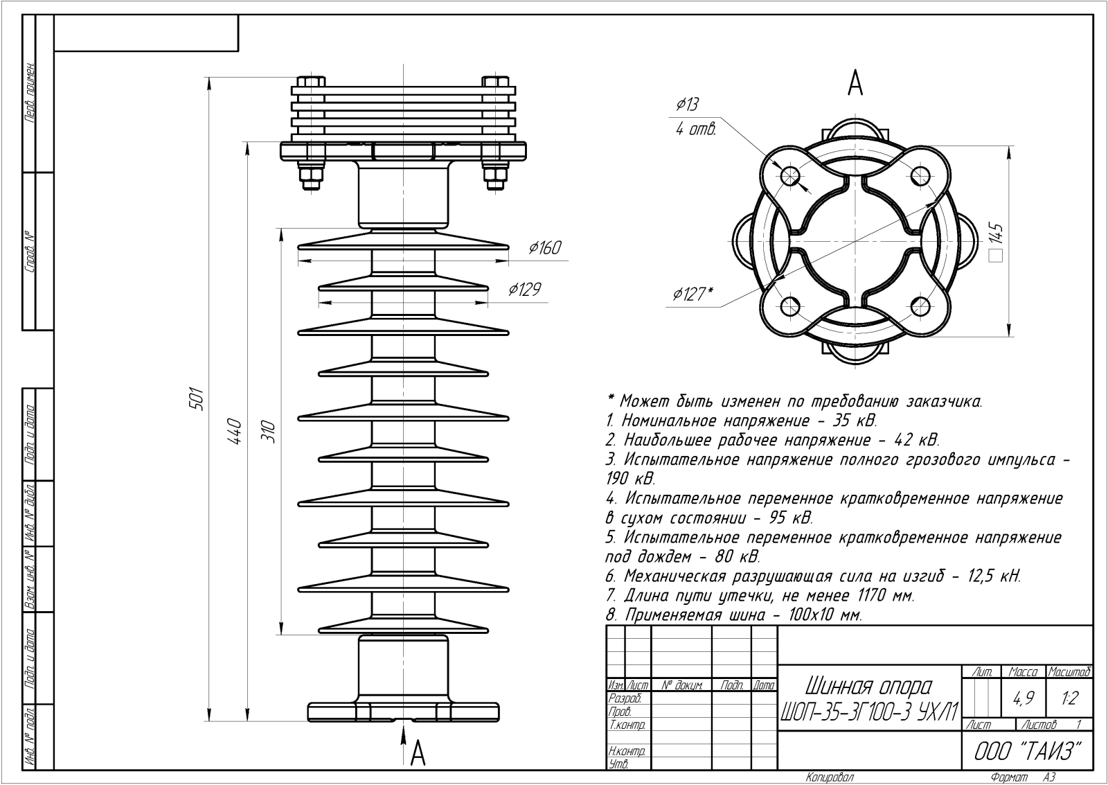 Главная » Продукция » Шинные опоры » Шинные опоры для жесткой ошиновки с горизонтальными плоскими шинами » Шинные опоры для жесткой ошиновки 35 кВ » ШОП-35-3Г100-3 УХЛ1